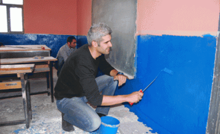 Şırnak'ın İdil İlçesi'ne bağlı Tepeli Köyü İlköğretim Okulu'nda görev yapan öğretmenler Aziz Tuna ile Abdulhak Gök, hafta içi köylü çocuklara ders verirken, hafta sonlarında ise okulun duvarlarını boyuyor, eksiklerini gideriyor.