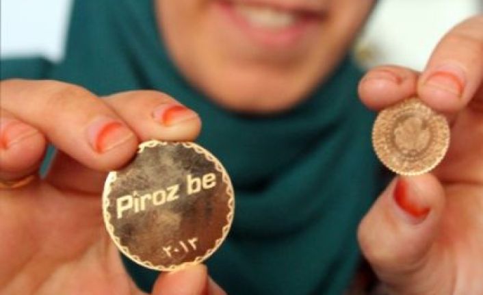 Mesut Barzani'nin Diyarbakır'da katıldığı toplu nikah törenindeki çiftlere hediye ettiği altınlardaki 'Piroz be' yazısı dikkat çekti.