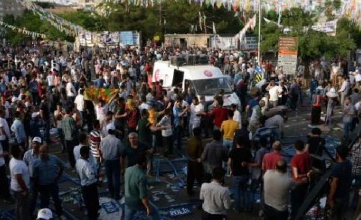 Diyarbakır İstasyon Meydanı'nda HDP'nin mitingi sırasında iki ayrı patlamada yaralanan 10 kişinin hastanede tedavisi devam ederken, bazılarının durumunun ağır olduğu belirtildi. Patlamalardan ilk saat 17.50 sıralarında platformdan yaklaşık 60 metre uzaklıktaki çöp kutusunda meydana geldi. Bu patlamanın trafodan kaynaklandığı anons edildi. Yaklaşık 5 dakika sonra bu kez hınca hınç dolu olan miting alanın yanındaki trafonun önünde kulakları sağır eden bir patlama meydana geldi. İlk belirlemelere göre parça tesirli bomba olduğu sanılan patlayıcının infilak etmesiyle, miting alanı bir anda karışırken, bu kesimde bulunanlardan 10 kadar kişi yaralandı. Kanlar içinde kalan yaralılar, koridor açılarak önce platformun yanına taşındı, ardından gelen ambulanslarla hastanelere sevk edildi. Yaralılardan durumu ağır olan ve bazı uzuvları kopanlar olduğu belirtildi.