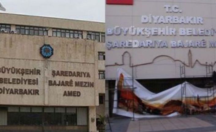 Diyarbakır Büyükşehir Belediye binasının yenilenen Kürtçe ve Türkçe tabelalarında Ulu Cami, On Gözlü Köprü, Dört Ayaklı Minare'nin silueti yer alıyor. Amed yazısı kaldırılırken T.C. yazısı ve Türkiye bayrağı eklendi.