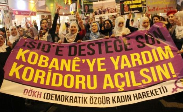Demokratik Özgür Kadın Hakareti (DÖKH) öncülüğünde İstanbul Tünel’de bir araya gelen kadın örgütleri, Kobanê’ye yaşam koridorunun açılması talebiyle Galatasaray Meydanı’na yürüdü. Zılgıtlar ve ıslıklar eşliğinde “IŞİD‘e desteğe son! Kobanê’ye yardım koridoru açılsın” pankartını açan kadınlar, DAİŞ çetelerine karşı fedai eylemi gerçekleştiren YPJ savaşçısı Arîn Mirkan‘ın fotoğraflarının yanı sıra YPJ bayraklarını taşıdı.