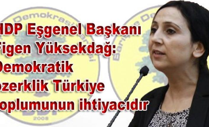 "Aynı zamanda alternatif bir toplumsal modelin temellerinin atılması ve inşasının başlanması anlamına geliyor" diyen Yüksekdağ, şunları söyledi: "Demokratik özerklik siyasetinin örgütlenmesi, ezilenlerin yerinden yönetime katılma, toplumun yeniden örgütlenmesinin geliştirilmesi anlamına geliyor. Demokratik özerklik fikri ve projesi sadece Kürdistan'da politik örgütsel konusu değildir. Aynı zamanda HDP'nin, Türkiye toplumunun kuvvetle ihtiyacı olduğu yaşam projesinin hayata geçirilmesi anlamını taşıyor. O açıdan tüm Türkiye'nin önündeki tarihsel mücadelelerden biridir. Bu şu anlama gelir; toplumun demokratik bilinçle yeniden örgütlenmesi, faşizmden, ırkçılıktan, erkek egemenliğinden, otoriterleşmeden arındırılarak yeni bir insani bilinci oluşturulması ve inşa edilmesi anlamına gelir."