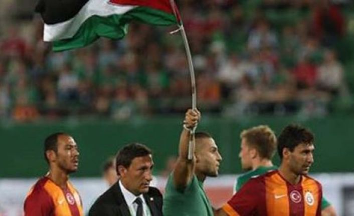 Galatasaray’ın Rapid Wien ile karşı karşıya geldiği mücadelede de sahaya giren taraftarlar Filistin bayrağı açtılar.
