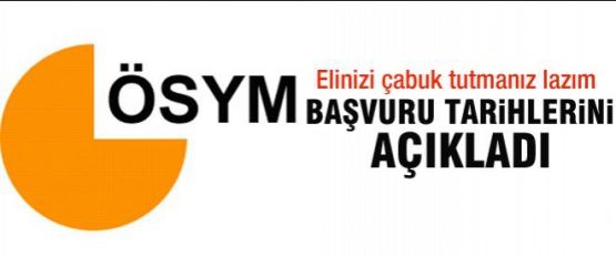 Buna göre, 23 Mart'ta yapılacak Yükseköğretime Geçiş Sınavı'na 02-15 Ocak'ta, 6 Nisan'da yapılacak Yabancı Dil Bilgisi Seviye Tespit Sınavı'na (İlkbahar Dönemi) 03-12 Şubat'ta, 27 Nisan'da gerçekleştirilecek Engelli Kamu Personeli Seçme Sınavı'na (EKPSS) 24 Şubat-7 Mart'ta, 11 Mayıs'ta yapılacak olan Akademik Personel ve Lisansüstü Eğitimi Giriş Sınavı'na (İlkbahar Dönemi ) 10-19 Mart tarihlerinde başvurulacak.