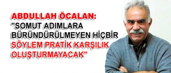 Öcalan, 'Çeşitli sıkıntı, engelleme, provokasyon, ağırdan alma ve tek yanlı dayatmalara rağmen yürüttüğümüz diyalog süreci yeni bir format altında ve yakın dönemde önemli bir pratikleşme aşamasına gelmiştir" dedi. Bu safhanın sadece ülkemizin değil, bölgemizin kaderini de belirleyeceğini belirten Öcalan, "Özellikle hükümetin bu ciddiyetle meseleye yaklaşması ve hız kazandırması hayati bir önemdedir' dedi. Öcalan, artık somut adımlara büründürülmeyen hiçbir söylemin pratik bir karşılık oluşturmayacağına dikkat çekti."