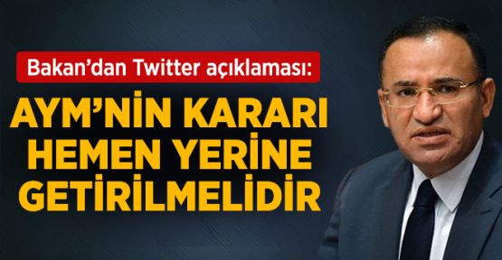 Adalet Bakanı Bozdağ, Anayasa Mahkemesi'nin Twitter'la ilgili verdiği karar için, "Mahkemenin kararı en kısa zamanda yerine getirilmelidir." dedi.