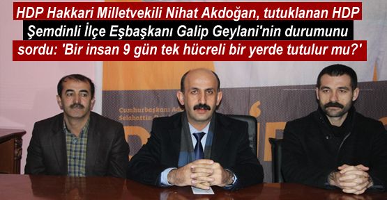HDP Hakkari Milletvekili Nihat Akdoğan, Hakkari’nin Şemdinli ilçesinde 14 Ocak'ta tutuklanan ve İlçe Emniyet Müdürlüğü'ndeki bir hücrede tutulan HDP İlçe Eşbaşkanı Galip Geylani'nin durumuna tepki göstererek basına açıklamada bulundu.