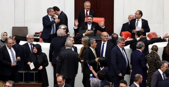 HDP milletvekilleri partilerine mensup tutuklu milletvekillerinin isimleri okunduğunda hep birlikte, "rehin" veya "cezaevinde" diye karşılık verdi.