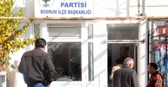 BDP Bodrum İlçe Teşkilatı’nın Cevat Şakir Mahallesi, Hoca Ahmet Yesevi Sokak’teki binası, bugün sabaha karşı kimliği belirsiz kişi veya kişilerce taşlanıp, molotof kokteyli atıldı. Sabah binaya gelen BDP Bodrum İlçe Başkanı Mehmet Polat ve yönetim kurulu üyeleri camların kırılıp içeri molotof atıldığını görünce durumu polise bildirdi. Atılan molotofun patlamaması nedeniyle yangın çıkmazken, atılan taşlardan binanın camları kırıldı. Polis, binada parmak izi incelemesi yapıp, 4 kişinin ifadesine başvurdu.