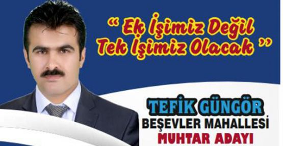 ‘Ek işimiz değil, tek işimiz”, “biz yarışa değil hizmete varız”, “Mahallemiz için el ele olma vakti”, “Mahallenin muhtarı, fedakarlıktır her anı”, “Mahallemiz için gönüllerimizi birleştirelim”, “Daha da gelişmiş bir mahalle için oyunu adayına ver”, “İyi hizmet herkesin hakkı” diyen Tefik Güngör, Beşevler Mahallesi’ne muhtar adayı olduğunu açıkladı.