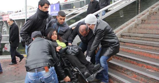 Kaldırıma çıkmayı başardıktan sonra bu kez tramvay, metrobüs ve otobüs duraklarının geçiş noktası olan üst geçide ilerliyoruz. Ama görüyoruz ki bu merkezi noktada asansör yok. Bu durumda Gözükızıl tekrar yardım istemek zorunda... Gözükızıl sinirleniyor: “Buraya tek başıma geldiğimi düşünün. Sonuç olarak her zaman yanımızda biri olmuyor. Yani ailemize bağımlı olduktan sonra oturup evimizde yaşayalım daha iyi” diyor. Yine çevreden yardım istiyoruz. Yine birkaç kişi yardımımıza koşuyor. ‘Ha gayret’ nidaları arasında Gözükızıl yukarıya çıkartılıyor. Üst geçide çıkıyoruz ama sıra merdiven inmek de. Yine yardım isteyen gözlerle çevreye bakıyoruz. Yanımıza gelen birkaç kişi “Asansör yok mu” diye soruyorlar şaşkın bir ifadeyle. Tabi tepki de gecikmiyor. Onlarda sandalyeyi dikkatli bir şekilde tutup aşağı indirme çabalarını fotoğraflamaya çalıştığım sırada içlerinden birisi, “Bu resimleri Kadir Topbaş’a gönderin görsün bu rezilliği” diye konuşuyor.