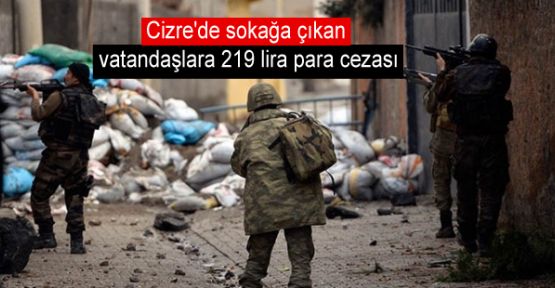 Şırnak'ın Cizre ilçesinde 14 Aralık'tan beri devam eden sokağa çıkma yasağı devam ederken, evden dışarı çıkan vatandaşlara 5326 Sayılı Kabahatler Kanunu'nun 32. Maddesi'ne göre 219 lira para cezası kesildi.