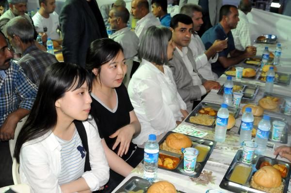 Açıklamanın ardından çadıra giren Demirtaş, iftarını açmak için bekleyen vatandaşlarla selamlaşarak sohbet etti. Demirtaş daha sonra sıraya girerek iftar yemeğini kendi aldı. Vatandaşların yoğun ilgisi altında kendisine ayrılan masaya geçen Demirtaş iftar saatini beklerken Büyükşehir Belediye Başkanı Gültan Kışanak ile sohbet etti. Selahattin Demirtaş, ezanın okunması üzerine dua ederek iftarını açtı. Diyarbakır'da bulunan Güney Koreli bazı turistler de iftar çadırında Demirtaş'ın masasına oturarak yemek yedi. / dha