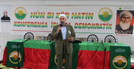 “Qirkirina Rojava qirkirina îslamê ye“, “Ne îslama Tirkî, ne îslama Farsî, ne îslama Erebî bes e bila were îslama rastî“, “Ne zulm, ne zordarî, edelet, wekhevî û biratî“ gibi pankartların asıldığı salonda, Şeyh Saîd, Mele Ebdullah Timoqî ve Şey Muhammed Mahşuk El Haznevî gibi Kürt İslam önderlerinin fotoğrafları asıldı.