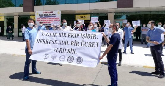 SES Diyarbakır Şubesi, Diyarbakır Tabip Odası, DİSK, TÜRK-İŞ ve TÜM İŞ’e bağlı sağlık emekçileri, ek ödeme dağıtımını Dicle Üniversitesi Hastanesi Başhekimliği önünde protesto etti. Korona virüsü (Covid-19) salgını nedeniyle maske takan sağlık çalışanları, sosyal mesafeye uyarak açıklamaya katıldı.