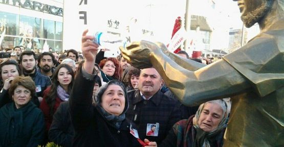 Kalabalığın sık sık 'Ali İsmail Korkmaz ölümsüzdür' diye slogan attığı törende yapılan konuşmaların ardından heykelin açılışını anne Emel Korkmaz, baba Şahap Korkmaz, ağabeyi Gürkan Korkmaz ile Hatay'dan gelen yakınları birlikte açtı. Anne Emel Korkmaz pet şişe ile oğlunun heykelinde avuçlarının içine kuşlar içsin diye su koydu. / Evrensel