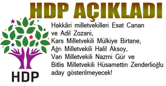 HDP bu milletvekillerinin yanı sıra iki dönem milletvekilliği yapan isimlerin yeniden aday gösterilmeme kuralı bulunuyor. Buna göre Aysel Tuğluk, Emine Ayna, Ayla Akat, Bengi Yıldız, Sabahat Tuncel, İbrahim Binici, Hasip Kaplan ve Özdal Üçer de aday olmayacak.
