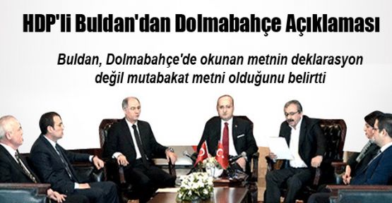TBMM Başkanvekili, HDP Milletvekili Pervin Buldan, son günlerde Cumhurbaşkanı Recep Tayyip Erdoğan'ın açıklamaları ile yeniden gündeme gelen Dolmabahçe toplantısı ile ilgili konuştu. Dolmabahçe'de okunan metnin deklarasyon değil mutabakat metni olduğunu belirten Buldan, toplantının Cumhurbaşkanı Erdoğan'ın bilgisi dahilinde yapıldığını ve oturma düzeni krizinin de, Yalçın Akdoğan'ın araması ile yine Erdoğan tarafından çözdüğünü söyledi.