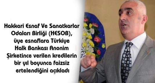 "13 Mart 2016 tarihi itibarıyla sokağa çıkma yasağı uygulanan Yüksekova ilçemizde Esnaf ve Sanatkarımıza yönelik çalışmalarımız sonucu, konfederasyonumuz (TESK) tarafından çalışma yürütülmüş ve kredi kefalet kooperatiflerimizce kefaleti olan Türkiye Halk Bankası Anonim Şirketince verilen krediler bir (1) yıl boyunca faizsiz ertelenmiştir.