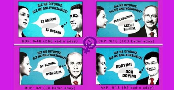 Kadın Adayları Destekleme Derneği (KA.DER), siyasi parti liderlerine eşit temsiliyet konusunda “Biz Ne Diyoruz Siz Ne Anlıyorsunuz!” diye seslenerek, “Kadınlar bu ülkenin yüzde 50’sini oluşturuyor. Peki meclisteki oranları neden yüzde 14?” diye sormuştu.