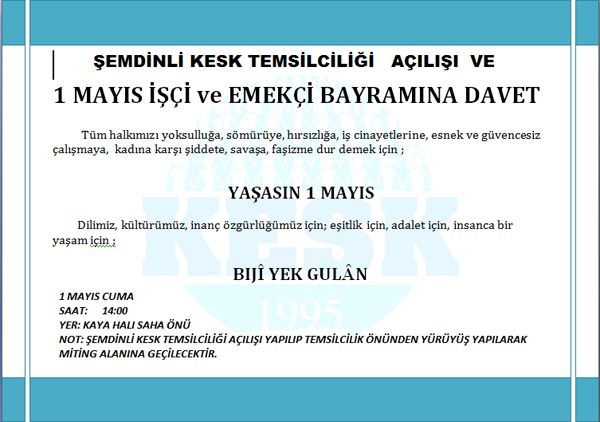 NOT : ŞEMDİNLİ NAVŞAR İŞ MERKEZİNDE BULUNAN TEMSİLCİLİĞİ AÇILIŞI YAPILDIKTAN SONRA KİTLESEL OLARAK 1 MAYIS KUTLAMALARININ YAPILACAĞI KAYA HALI SAHA TESİSLERİNDE KUTLAMALARA KATILACAĞI KAYDEDİLDİ.