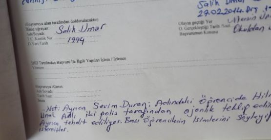 Para cezasına çarptırılan Salih U. Adlı öğrenci polislerin yoğun baskısına maruz kaldığını ifade ederek, durumun açığa çıkartılması için İHD Mersin Şubesine başvurduğunu belirterek, kendisi ve başka öğrenci arkadaşlarına yönelik ajanlık dayatmasını şöyle anlattı: “üniversite’de düzenlenen demokratik bir eyleme katıldığım gerekçe gösterilerek para cezasına çarptırıldım. Aslında eylemin olduğu gün ve saatte Akdeniz İlçesinde olmama rağmen bana 10 gün okuldan uzaklaştırma ve para cezası verildi. Ailem rahatsız edilince üzerimde büyük bir baskı oluştu. Daha sonra 05.. 38008 19 numaralı telefon beni aradı. Polis olduğunu söyledi ve en yakın polis karakoluna gelip benimle özel bir mesele konuşacağını söyledi. Bende işim var gelemem dedeme rağmen ‘müsait olduğunda gel’ dayatmasını yaptı. Ama gitmedim şu an bile sivil polislerin takibindeyim artık yalnız gezemeyecek duruma gelmişim. Ayrıca Sevim D. Adlı öğrenci arkadaşımızı yolda alan Hilmi ve Unal adlı iki sivil polis tarafından ajanlık teklifinde bulunmuş ve bazı öğrencilerin üzerinde ifade verdikleri takdirde haklarında açılan davanın kalkacağı vaadinde bulunmuşlar” dedi. / anf