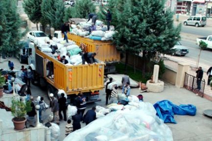 Rojava ile dayanışma amacıyla başta Hakkari ve Ağrı'da toplandıktan sonra Mardin'in Kızıltepe ve Nusaybin ilçelerine gönderilen ihtiyaç malzemeleri ve tıbbi ilaçlar, burada toplanan yardım malzemeleri ile birlikte 25 kamyona yüklendikten sonra Rojava'ya gönderilmek üzere Şenyurt Sınır Kapısı'na getirildi. BDP Kızıltepe İlçe Başkanı Fettah Tekin, Kızıltepe Belediye Başkanı Ferhan Türk, Nusaybin Belediye Başkanı Ayşe Gökkan, belediye başkan yardımcıları ile belediye meclis üyeleri tarafından sınır kapısına getirilen yardımlar buradan da Rojava'nın Dirbesiyê kentine gönderilmek üzere Kızılay ekiplerine teslim edildi.
