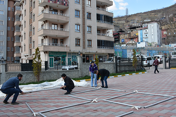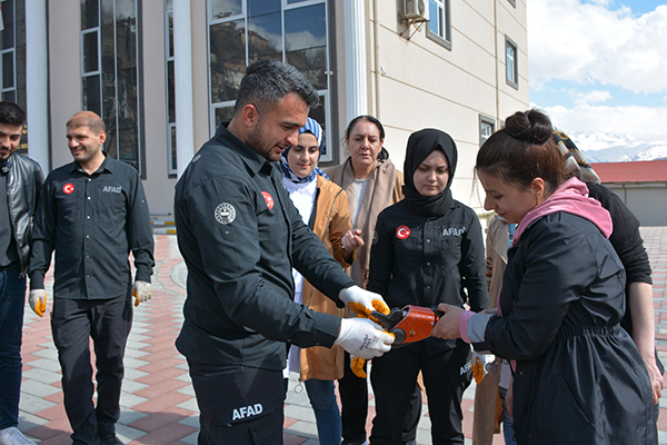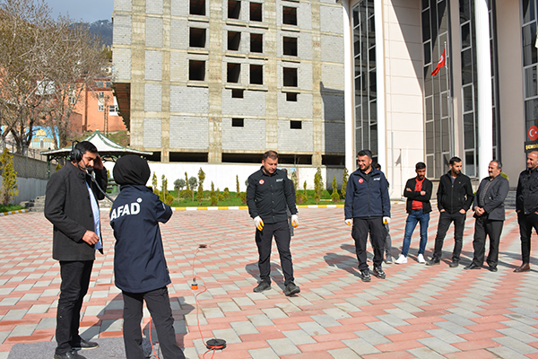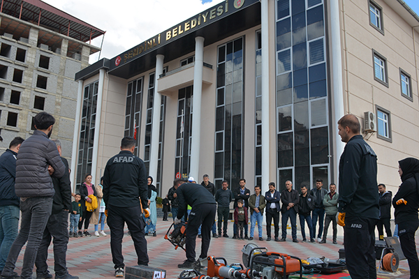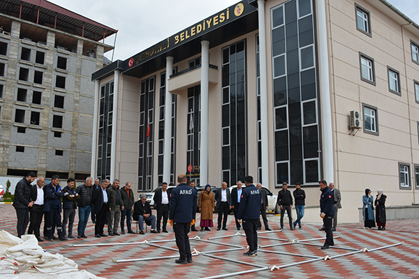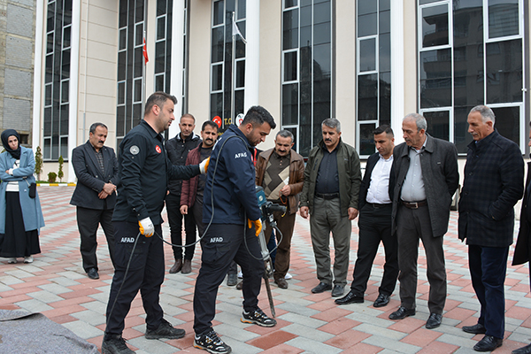 AFAD ekipleri daha sonra belediye bahçesinde hafif arama kurtarma eğitimi de vererek, seminere katılan muhtar ve gönüllülere AFAD anında kullanılacak malzemeler, ekipmanlar ile çadır kurulumu hakkında da uygulamalı bilgi verdi.