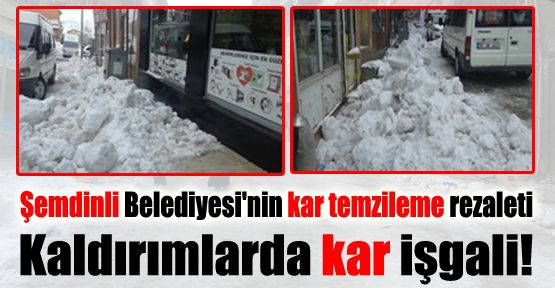 Şemdinli ilçesinde etkili olan kar yağışı hayatı olumsuz etkililyor. Cumhuriyet caddesinde önceki gün ve dün Şemdinli Belediyesi tarafından kar temizleme çalışmaları başlatıldı. Ancak iş makinaleri tarafından kaldırımlara savrulan karlar ise ilk gün olduğu gibi temizlenmeyince vatandaşların tepkisine neden oldu. Cumhuriyet caddesindeki bir çok nokta da kaldırımlar iş makineleri tarafından savrulan karlar tarafından işgal edilmiş durumda. Kaldırımları kullanamayan vatandaşlar caddeyi kullanınca sürücüleri de zor durumda bırakıyor.