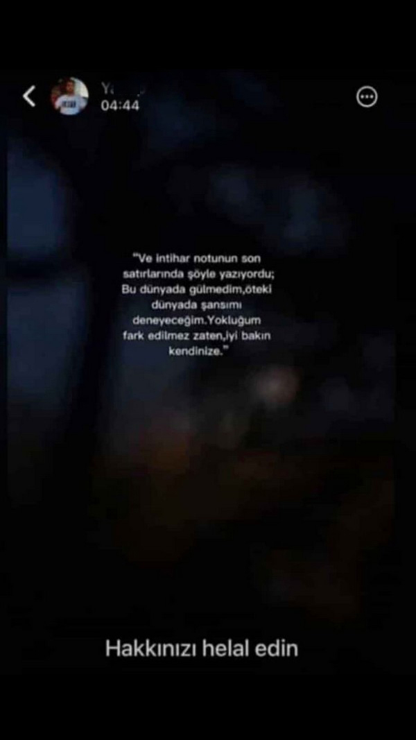 Silahla intihar eden Y. Y, bugün sabah saat 04.44'de kişisel sosyal medya hesabından; " Ve intihar notunun son satırlarında şöyle yazıyordu. Bu dünyada gülmedim, öteki dünyada şansımı deneyeceğim. Yokluğum fark edilmez zaten, iyi bakın kendinize. Hakkınızı helal edin." paylaşımında bulunarak, yaşamına son verdi.
