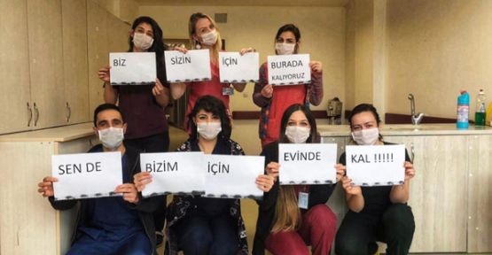 Sağlık çalışanları "Biz sizin için burada kalıyoruz. Sen de bizim için lütfen evde kal" notlarını paylaşarak vatandaşlardan zorunlu olmadıkça dışarı çıkmamalarını istedi.