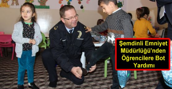 Şemdinli İlçe Emniyet Müdürlüğü tarafından, Şemdinli Sabri Özel Ortaokulu ile Yavuz Sultan Selim İlkokulu’nda okuyan ve ihtiyaç sahibi öğrencilere bot yardımı yapıldı. İlçe Emniyet Müdürü Metin Kanyer ve Toplum Destekli Polislik Şube Müdürlüğü ekipleri tarafından dağıtımı yapılan botlar ihtiyaç sahibi öğrencilere dağıtıldı. Bot alan öğrencilerin sevinci yüzlerine yansıdı. Emniyet Müdürü Metin Kanyer, kensi öğrencilere bot giydirirken, öğrenciler İlçe Emniyet Müdürü Metin Kanyer ile beraberinde bulunan emniyet teşkilatına teşekkür etti.