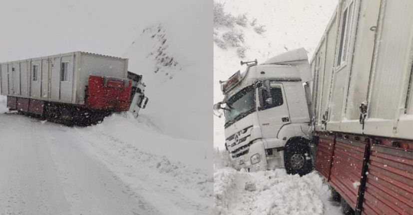 Hakkari ve ilçelerinde dün akşam saatlerinde başlayan kar yağışı etkisini sürdürüyor. Yüksekova-Şemdinli karayolunun haruna mevkiinde yoğun kar yağışı ve buzlanma nedeniyle saat 09.00 sıralarında kontrolden çıkaran bir TIR yol ortasında makaslama yaparak mahsur kaldı. Kaza yapan TIR nedeniyle onlarca araç mahsur kaldı.