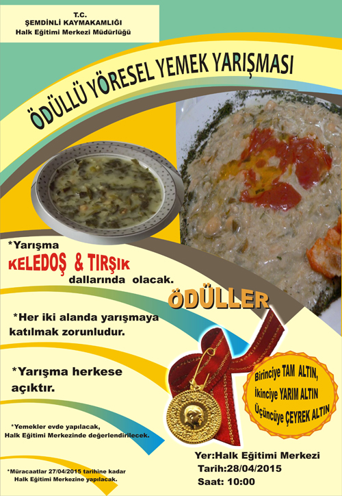 Şemdinli Halk Eğitim Merkezi Müdürlüğü tarafından Şemdinli ilçesinde ödüllü yöresel yemek yarışması düzenleniyor. Şemdinli’nin en kadim yöresel yemeklerinden olan Keledoş ile Tırşık yemeği dalında düzenlenecek yarışmada birinci gelen yarışmacıya tam altın, ikinci gelen yarışmacıya yarım altın ve üçüncü gelen yarışmacıya ise çeyrek altın hediye edilecek.