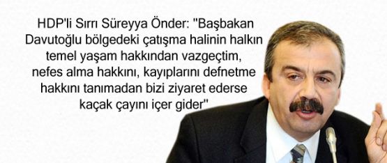 Başbakan Ahmet Davutoğlu’nun yeni anayasa kapsamında 30 Aralık’ta HDP eş başkanlarıyla gerçekleştirilmesi planlanan görüşmeye değinen Önder, “Başbakan Davutoğlu’nun anayasayı konuşmak için partiyi ziyaret etmesinin bir anlam ve netice doğurması, kendi ziyaretinden önce ülkenin anayasal bir zemine çekilmesiyle mümkündür. Bundan kastım, bölgedeki çatışma halinin halkın temel yaşam hakkından vazgeçtim, nefes alma hakkını, kayıplarını defnetme hakkını tanımadan bizi ziyaret ederse kaçak çayını içer gider” dedi.