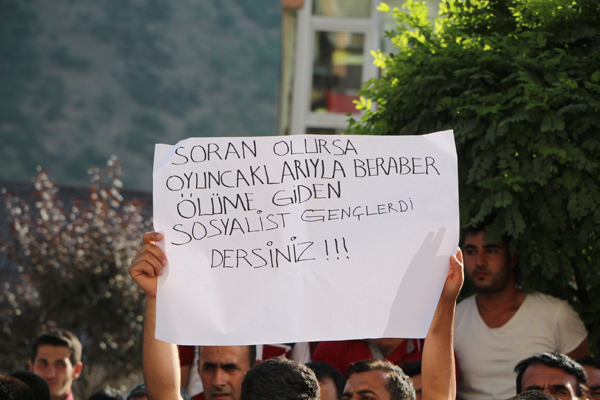 Sosyalist Gençlik Dernekleri Federasyonu (SGDF) tarafından Kobanê’nin yeniden inşasına katkı sunmak üzere Türkiye'nin birçok kentinden "Kobanê'yi beraber savunduk, beraber inşa edeceğiz" şiarı ile toplanarak oyuncakları ve umutları ile yola çıkıp Suruç'a giden gençlere yönelik yapılan hain katliam Şemdinli'de yürüyüş ve basın açıklamasıyla protesto edildi.