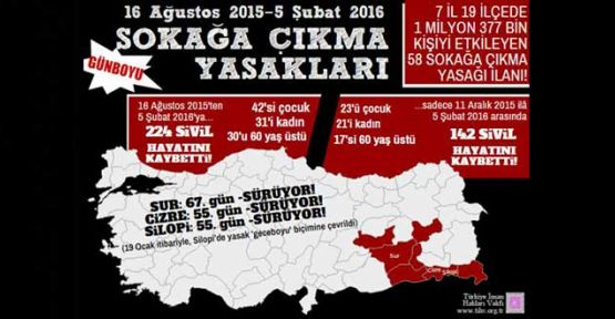 Raporda, 16 Ağustos 2015 ile 5 Şubat 2016 tarihleri arasında başta Diyarbakır, Şırnak ve Mardin olmak üzere Hakkâri, Muş, Elazığ ve Batman’a bağlı 19 ilçede en az 58 kez süresiz ve gün boyu sokağa çıkma yasağı ilânı edildiği kaydedildi.