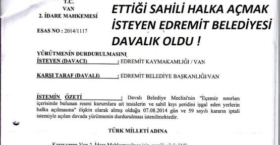 Van’da yıllardır süren kıyı işgali problemine son vermek amacıyla DBP’li Edremit Belediye Meclisi tarafından Ağustos ayında alınan kıyıların halka açılması kararı mahkemelik oldu. Edremit Belediye Meclisi ilçe sahil kısmında yerleşim yerleri içinde olan ve yüzme, piknik gibi sosyal aktivitelerin yapılacağı kıyı şeridinin en uygun alanlarının Karayolları, DSİ, Su Sporları Müdürlüğü gibi resmi kurum kuruluşlarca kapatılmasına ilişkin, halktan gelen yoğun şikayet ve talep üzerine söz konusu sosyal tesis alanların halka açılmasına ilişkin kararı oy birliğiyle aldı. Karara itiraz eden Edremit Kaymakamlığı ise, dava dilekçesinde “Kararın hukuki bir değeri yoktur. Karar hukuki kabul edildiği takdirde belediye meclisi başta özel ve tüzel kişilere ait yerler üzerinden tasarrufta bulunmak üzere telafisi mümkün olmayan mağduriyet ve karışıklıklara sebep olacaktır” gerekçesiyle Van 2. İdare Mahkemesine başvurarak kararın iptalini istedi.