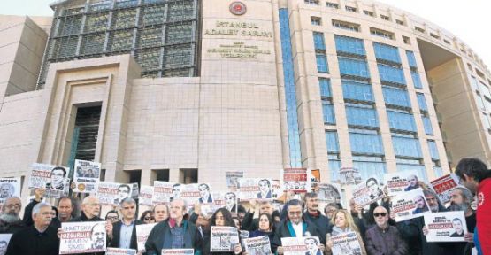 Cumhuriyet gazetesi çalışanlarının yargılandığı davaya bugün İstanbul Adliyesi 27’nci Ağır Ceza Mahkemesi’nde devam edildi. Duruşma öncesi adliye önünde İstanbul, Ankara baroları ile gazeteciler basın açıklaması yaparak, tutuklamalara son verilmesini talep ettiler.