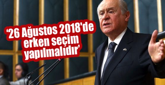 MHP Genel Başkanı Devlet Bahçeli, erken seçim çağrısı yaparak, "Cumhurbaşkanlığı Sistemi henüz tam devreye girmedi. Türkiye'nin 3 Kasım 2019'a kadar dayanması kolay değildir. 3 Kasım 2019'a kadar ulaşmak her dakika zorlaşmaktadır. Bu şartlar altında Türkiye'nin seçim için 3 Kasım 2019'u beklemesi mümkün değil. Malazgirt Zaferi'nin yıldönümünde, 26 Ağustos'ta seçime gidilmelidir" dedi. Yerel seçimlerin cumhurbaşkanlığı seçiminden önce yapılmasının ittifaka zarar verebileceğini anlatan Bahçeli "Cumhurbaşkanlığı seçimi acil bir hal almıştır" yorumunda bulundu.