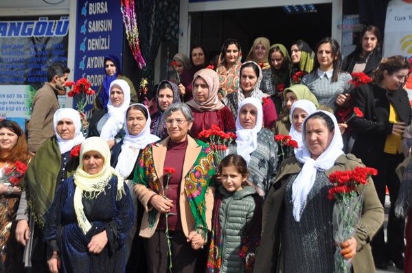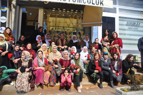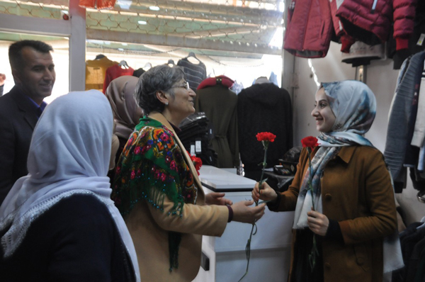 Konuşmaların ardından heyet ilçe esnafını gezerek 8 Mart Dünya Kadınlar günü vesilesiyle çiçek dağıttı.