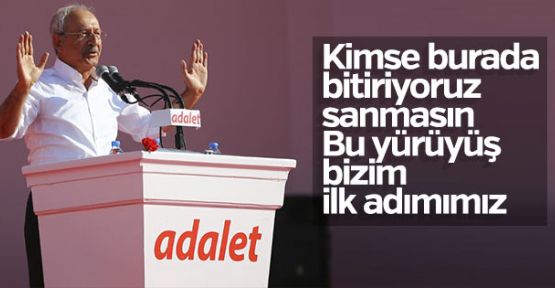 İLK ADIMDIR… Aziz vatandaşlarım, benimle birlikte 450 km’yi kat eden sevgili arkadaşlarım. Sevgili adalet arayışcıları. Maltepe meydanından bütün Türkiye’ye gönül dolusu muhabbetler gönderiyoruz. 15 Haziran 2017’de sabah saatlerinde Ankara Güvenpark’ta başladığımız yürüyüşü Maltepe’de noktaladık ama kimse bu yürüyüşün bir son olduğunu düşünmesin. Bu yürüyüş bizim ilk adımımızdır. Ankara’da yürüyüşe başladığımda bir grup yurttaşımızla birlikte ilk gün 21 km’yi 10 dakikalık arayla bitirdik. Yol boyunca bizi yüreklendiren, bize destek veren yerlere yürekten teşekkürlerimi sunuyorum. Yol boyunca yürürken araç kullanıcıları bazen kornayla bazen elleriyle bizi yüreklendirdiler. Onlara da buradan şükranlarımı gönderiyorum. Bize sofrasını açan, ayranını ikram eden, çayını ikram eden, yemek gönderen, topladığı kır çiçeklerini sevgiyle bize veren, hayır dualarım sizinledir diye annelere, babalara, dedelere şükran borçluyum. Buradan onlara teşekkürlerimi gönderiyorum. Yol boyunca büyük bir kısmını birlikte yürüdüğümüz Harp Okulu’ndayken tutuklanan oğlu için yürüyen Veysel Amca’ya da teşekkürlerimi gönderiyorum. Ve tabii ki yolda gelirken bizi protesto eden sevgili vatandaşlarımız da vardır. Kemal Kılıçdaroğlu herkese saygılıdır. Onlara da teşekkür ediyorum. Bu ülkeye birinci sınıf demokrasini getireceğiz. Herkes düşüncesini ifade edebilecek. Bir teşekkürüm de güvenlik güçlerimize. Ankara’dan İstanbul’a kadar polisinden jandarmasına bütün güvenlik güçleri bizim burada sağlıklı olarak toplanmamız için çaba harcadılar. Hiç kimse unutmasın biz yürürken taşkınlık yapacağımızı düşünüyorlardı. Vurup kıracağımızı düşünüyorlardı. Dünyanın en barışçıl eylemini yaptık.