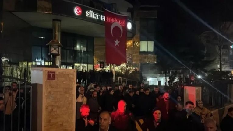 Belediye binası önünde DEM Partililerin ve Siirtlilerin bekleyişi sürüyor.