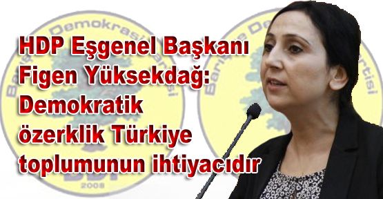 "Aynı zamanda alternatif bir toplumsal modelin temellerinin atılması ve inşasının başlanması anlamına geliyor" diyen Yüksekdağ, şunları söyledi: "Demokratik özerklik siyasetinin örgütlenmesi, ezilenlerin yerinden yönetime katılma, toplumun yeniden örgütlenmesinin geliştirilmesi anlamına geliyor. Demokratik özerklik fikri ve projesi sadece Kürdistan'da politik örgütsel konusu değildir. Aynı zamanda HDP'nin, Türkiye toplumunun kuvvetle ihtiyacı olduğu yaşam projesinin hayata geçirilmesi anlamını taşıyor. O açıdan tüm Türkiye'nin önündeki tarihsel mücadelelerden biridir. Bu şu anlama gelir; toplumun demokratik bilinçle yeniden örgütlenmesi, faşizmden, ırkçılıktan, erkek egemenliğinden, otoriterleşmeden arındırılarak yeni bir insani bilinci oluşturulması ve inşa edilmesi anlamına gelir."