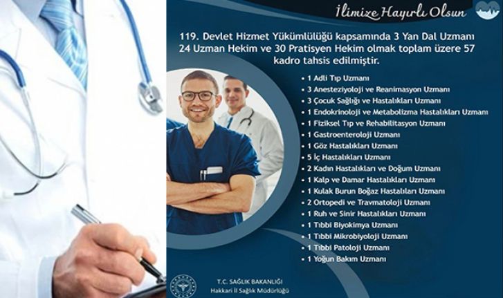 Hakkari Valiliği, 119. Devlet Hizmet Yükümlülüğü kapsamında Hakkari’ye 57 yeni doktor kadrosu tahsis edildiğini duyurdu. Sağlık alanında önemli bir adım olarak değerlendirilen bu tahsis kapsamında, 3 yan dal uzmanı, 24 uzman hekim ve 30 pratisyen hekim Hakkari’de görevlendirilecek.