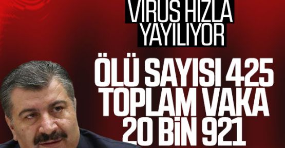 Sağlık Bakanı Koca, son 24 saatte korona virüsü nedeniyle 69 kişinin daha öldüğünü açıkladı. Son rakamla birlikte Türkiye’de virüs nedeniyle can kaybı 425’e yükseldi. Sağlık Bakanı, yine son 24 saatte 2 bin 786 yeni vaka tespit edildiğini belirtti. Toplam vaka sayısı 20 bin 921’e ulaştı. Bakanın duyurduğu rakamlara göre, İstanbul’da 12 bin 231, İzmir’de 1105, Ankara’da 860, Konya’da 601, Kocaeli’de 500 vaka var. 56 ilde virüs nedeniyle vefat yaşandı. / DUVAR