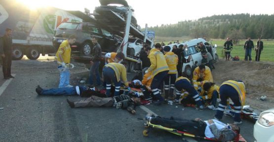 Kaza, bugün saat 06.45 sıralarında Konya- Afyonkarahisar karayolunun 20'nci kilometresinde meydana geldi. Direksiyon başında uyuduğu iddia edilen ve Halil İbrahim Esen 33 JCB 16 plakalı TIR, karşı şeride geçip Sarayönü İlçesi'nden Konya'ya yolcu taşıyan Osman Demirkol (55 ) yönetimindeki 42 Z 4723 plakalı minibüs ile Sebahattin Özçıray (42) kullandığı 34 SH 6973 araç yüklü kamyona çarptı. Kazada 7 kişi olay yerinde 3 kişide kaldırıldığı hastanede yaşamını yitirdi. 2'si ağır 11 kişide yaralandı. Yaralılar, ambulanslarla kentteki çeşitli hastanelere kaldırıldı.
